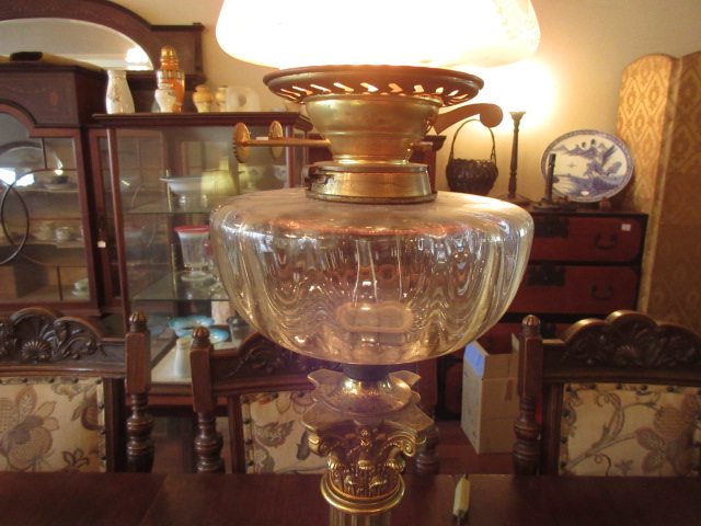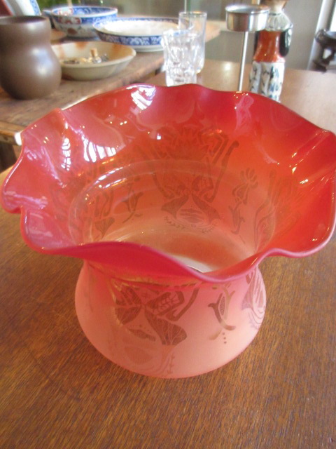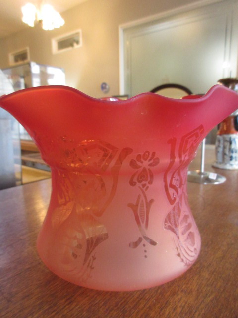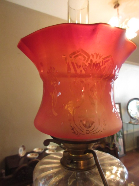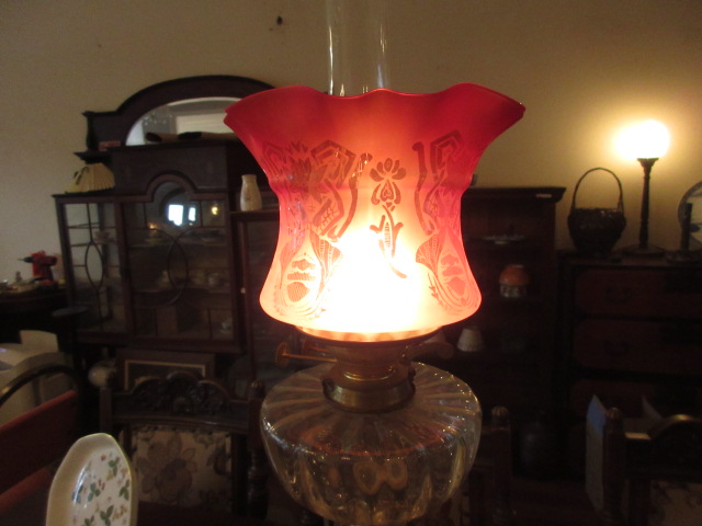 美しいクランベリーガラスシェードの下には透明のオイル入れ、台座まですべてオリジナル。