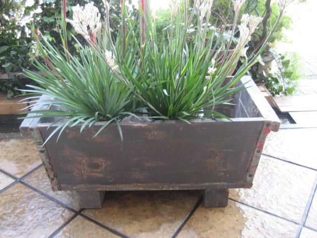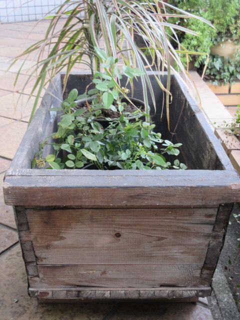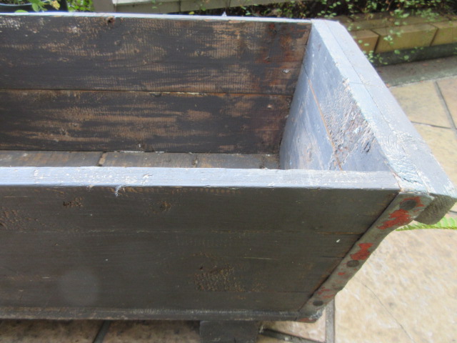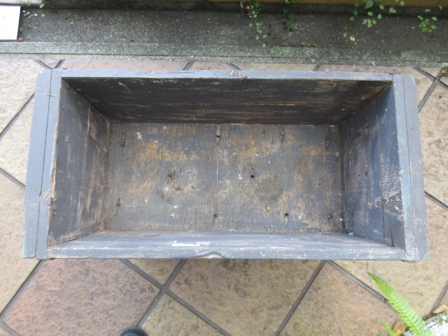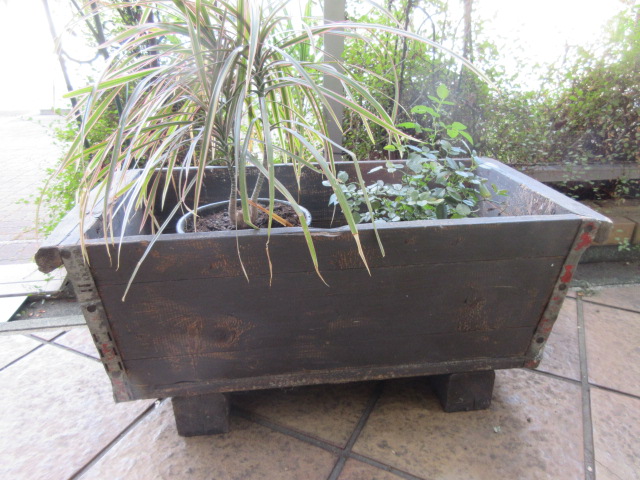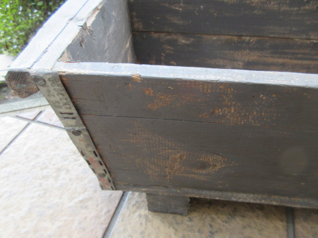 木製のポットボックス。四隅にブリキで補強がされています。