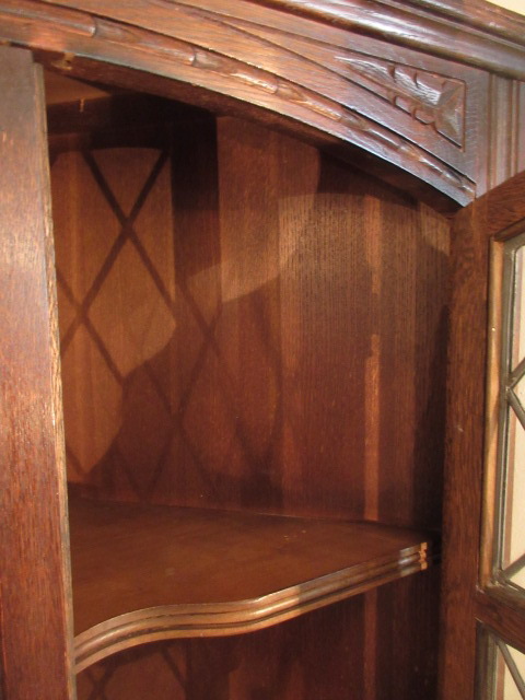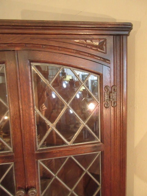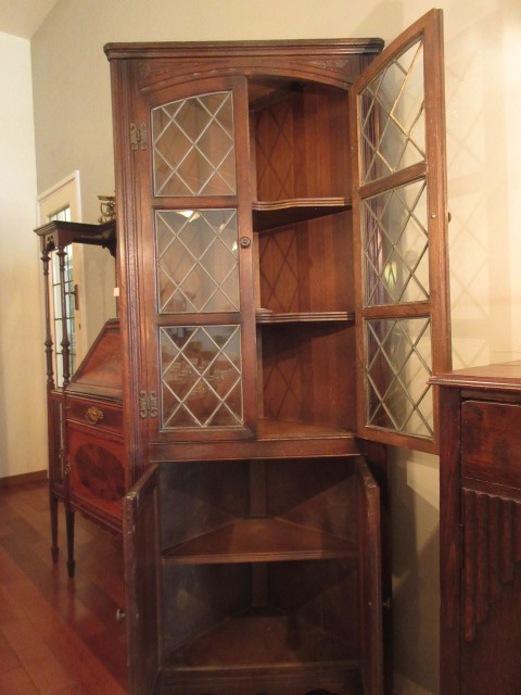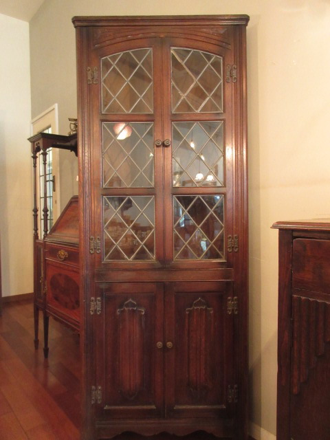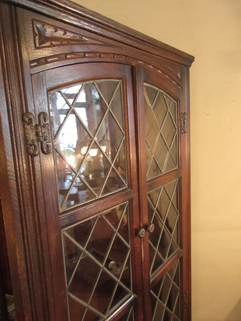 ステンドグラスのガラス入りのコーナーキャビネット。