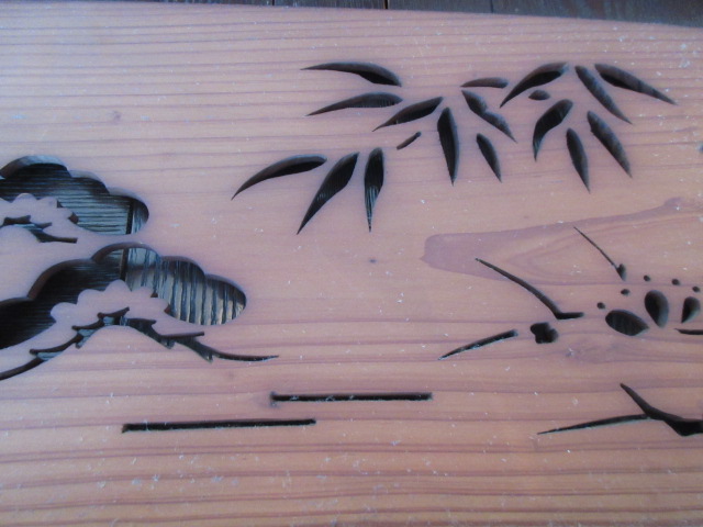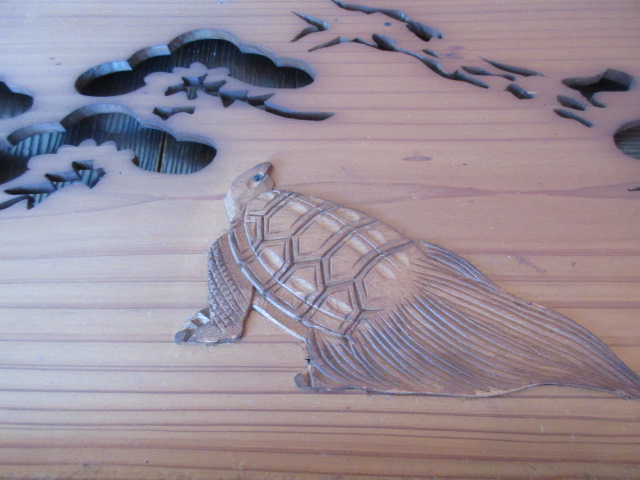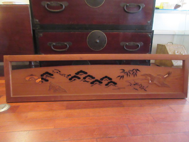 明治〜大正時代の欄間です。松竹梅鶴亀のおめでたい模様が彫られています。