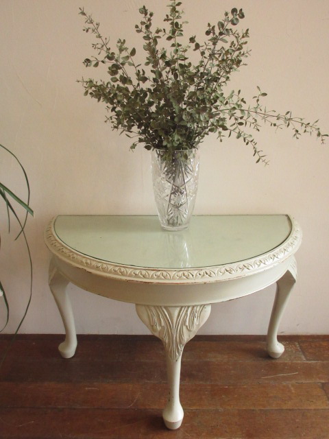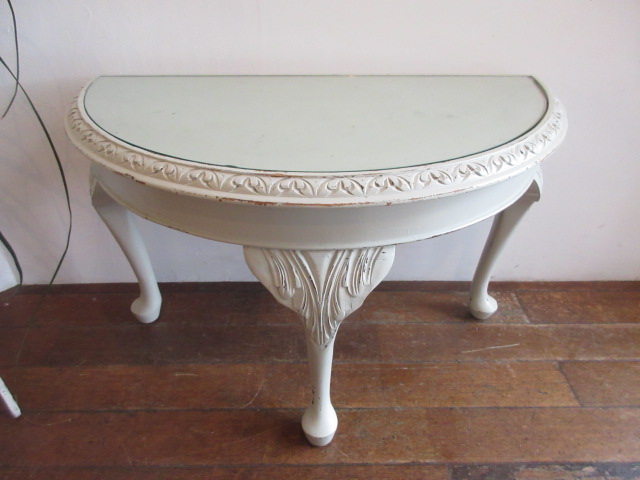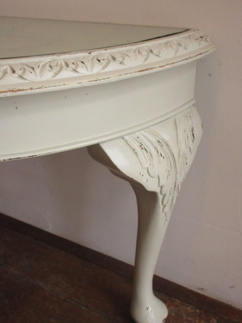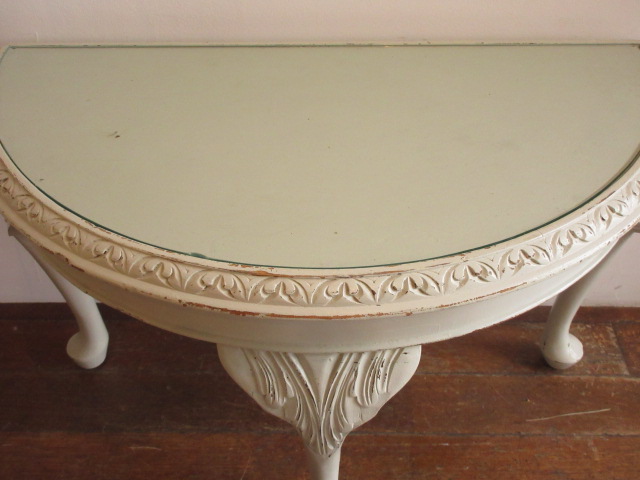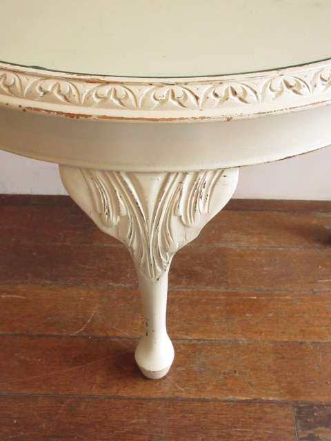 オフホワイトのペイントがフランスらしいですが、凝った彫り模様が施され1900年頃の古いお品です。天板の縁内にはガラスが入っています。