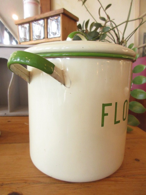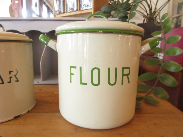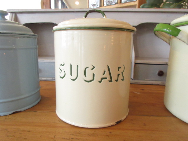 | ENGLAND ホーローキャニスター ホーロー3点、いずれもアンティークホーローです(最近は余り見なくなりました)。 ブルーは紅茶、中のベージュは砂糖、右は小麦粉を入れて使われていました。 なにか可愛くて温かみのあるアンティークホーロー、乾物入れにしたり、お菓子入れにしたり〜。 楽しんで使って下さいね♪ サイズ ブルー 直径 13.5cm H 22cm SUGAR 直径 16.5cm H 21cm FLOUR 直径 19.5cm H 23cm プライス SOLD |