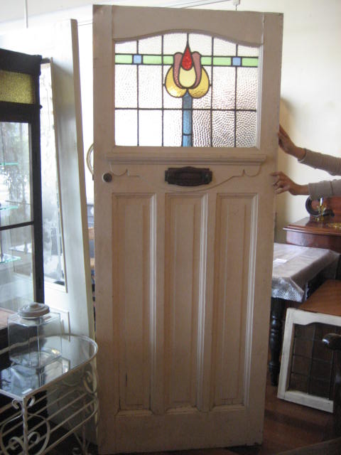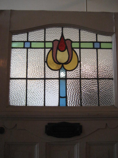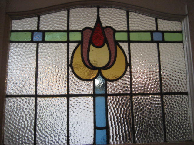ラクチャーガラスのステンドが素敵な、重厚なドア。