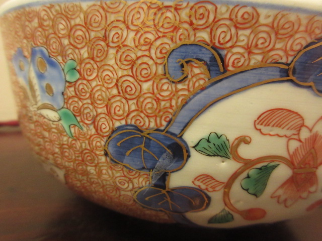 周囲には縁起の良い渦模様が繋がる錦鉢です。