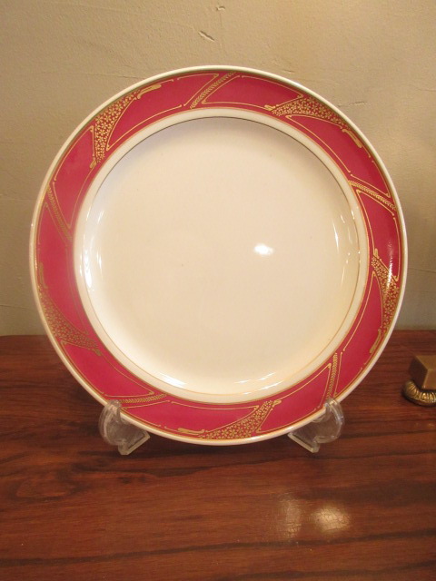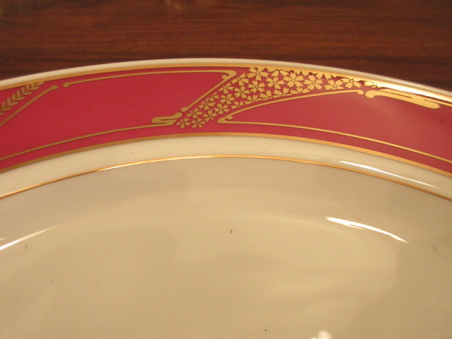 濃いピンクの縁には金彩で細かな模様と縁取りが描かれています。